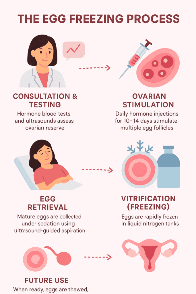 Egg freezing, or oocyte cryopreservation, is a medical procedure where a woman’s eggs are collected, frozen, and stored for future use. The main goal is to preserve fertility for a later stage in life when natural conception may be more difficult due to declining egg quality. Thanks to advanced vitrification techniques, frozen eggs can survive for many years with minimal loss in quality, giving women more reproductive choices.
